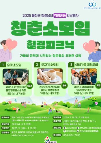 [뉴스스텝] 울진군은 미혼 남녀들의 특별한 만남 행사인‘청춘동아리 소모임 및 피크닉 매칭투어’를 지난 봄 시즌에 이어 9월 27일과 28일, 이틀간 개최한다.