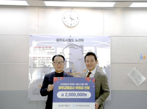 [뉴스스텝] 광주교통공사가 최근 광주시 서구 마륵동 본사에서 (사)한국 백혈병소아암협회 광주전남지회에 임직원들이 정성으로 모은 성금 200만 원을 전달하며 환아들의 따뜻한 연말연시를 기원했다.