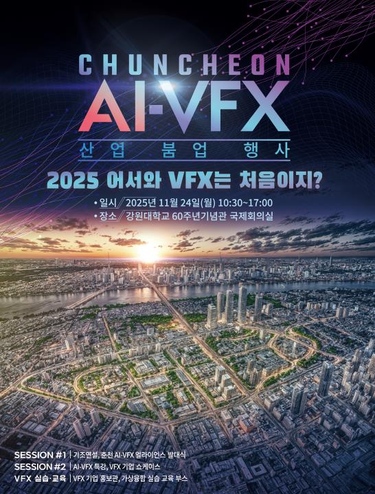 [뉴스스텝] 춘천시는 2025년 11월 24일 강원대학교 60주년 기념관 국제 회의실에서 ‘춘천 AI-VFX 산업붐업행사 – 2025 어서와! VFX는 처음이지?’를 개최한다고 밝혔다.