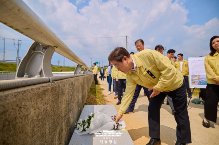 이 대통령은 사고 이후 차량 진입 차단 시설과 비상 대피 시설, 차수벽과 핸드레일 등이 설치된 지하차도 일대를 살펴보면서 "재난 대책 시설물 개선과 재정 지원만큼이나 작동 점검이 중요하다"고 강조했다.