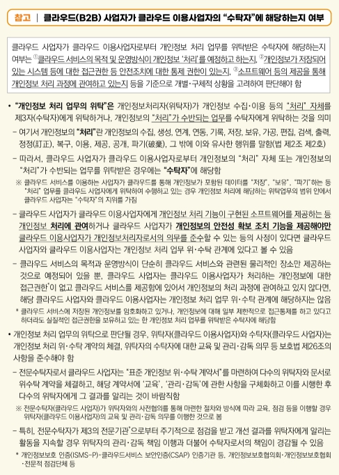 이에 대해 개인정보위는, 클라우드사업자가 이용사업자의 데이터에 접근하지 않는다는 사실을 약관 등에 명시하고, 보안 인증 등을 통해 제3의 전문기관으로부터 주기적으로 점검을 받고 이를 이용사업자에게 알리는 방법으로 보호법상 위·수탁 관리·감독 절차를 대체할 수 있다는 해결방안을 제시했다.