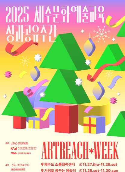 [뉴스스텝] 제주문화예술재단은 오는 27일부터 30일까지 4일간 제주도 소통협력센터(제주시 관덕로 44)와 서귀포 꿈꾸는 예술터(서귀포시 천제연로 164)에서 2025년 제주문화예술교육 성과를 도민에게 공유하는 문화예술교육 축제인 '아트리치위크'를 운영한다.