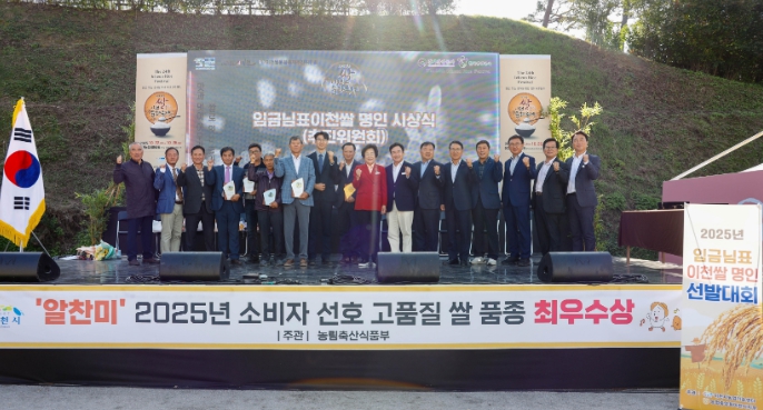 명인 선발은 벼 재배 현장 평가와 백미 품위, 외관 성분, 식감 기계 분석 등 종합 심사를 거쳐 마장면 김동리 농업인이 ‘2025년 임금님표이천쌀 명인’으로 선정됐으며, 금상 이상윤(장호원읍), 은상 이병일(호법면), 동상 원종고(대월면), 한양희(모가면) 농업인이 각각 수상의 영예를 안았다.