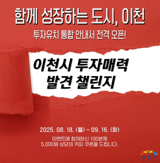 이천시는 투자 환경 홍보를 위한 ‘이천시 투자매력 발견 챌린지’도 진행 중이다. 게시판 방문 인증샷과 이천시만의 가장 매력적인 투자 환경을 설문폼에 작성하면 선착순 추첨을 통해 5,000원 상당의 커피 쿠폰을 제공한다. 9월 16일까지 진행되는 이 이벤트는 부담 없이 기업과 시민 모두에게 이천시 투자 환경을 알릴 기회가 될 것으로 기대하고 있다.