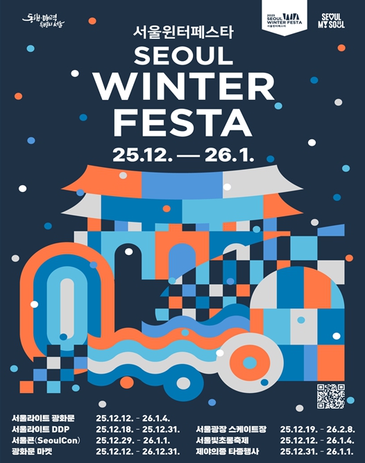 서울시는 12월 12일부터 2026년 1월 4일까지 24일간, 광화문광장~청계천~서울광장~DDP~보신각~우이천 6곳을 잇는 초대형 겨울축제 '2025 서울윈터페스타'를 개최한다고 밝혔다. 올해 행사는 궁중문화축전 및 전국무용제 등 대한민국 대표축제를 성공적으로 이끈 이재원 총감독이 지휘한다.