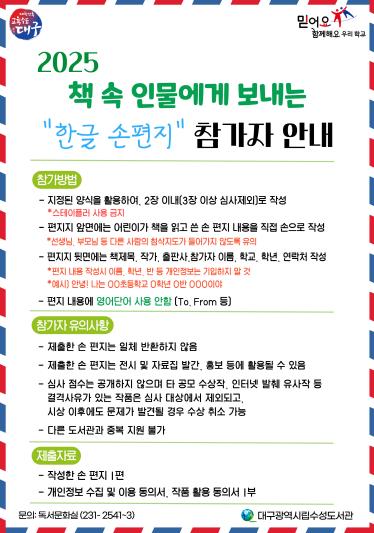 ▲ 대구수성도서관, ‘책 속 인물에게 보내는 한글 손 편지’ 공모전 참가자 모집 |