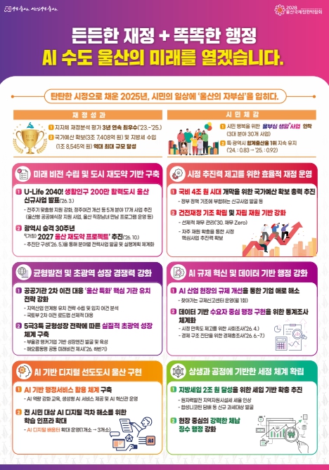 울산시는 지난해 건전한 재정 운영과 시민 체감형 정책 성과를 바탕으로, 도시 경쟁력을 한 단계 끌어올리며 ‘울산의 자부심’을 시민 일상 속에 안착시켰다고 평가했다.