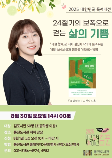 [뉴스스텝] 김포시 통진도서관은 '2025 대한민국 독서대전' 개최를 기념하여 ‘작가와의 만남’ 프로그램인 ‘24절기의 보폭으로 걷는 삶의 기쁨’을 8월 30일 오후 2시부터 운영한다고 밝혔다.