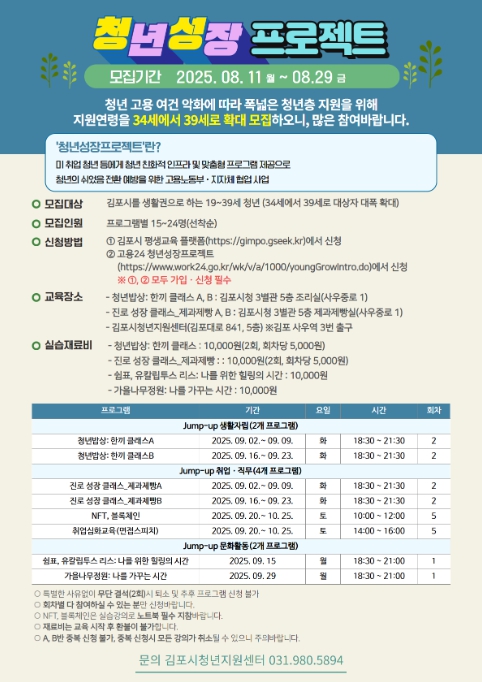 [뉴스스텝] 청년 역량 강화와 진로 개발 지원에 적극 나서고 있는 김포시가 2025년 하반기 ‘청년성장 프로젝트’ 9월 프로그램 참가자를 모집한다.