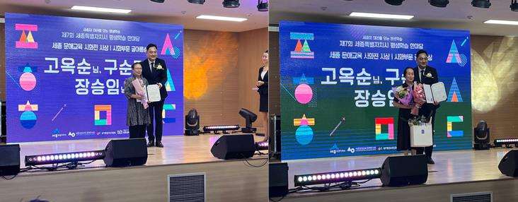 [뉴스스텝] 세종특별자치시교육청평생교육학습관은 문해교육을 통해 배움의 기쁨을 알아가고 있는 구순덕(1950년생)어르신과 장승임(1950년생)어르신이 9월 18일에 보람종합복지센터 대강당에서 열린‘2025년 전국 성인문해교육 시화전 행사’에서 글아름상을 수상했다고 밝혔다.
