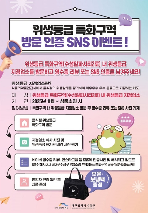 방문객이 위생 등급 지정업소를 이용한 뒤 네이버 영수증 리뷰를 작성하거나, 음식사진 또는 위생 등급 표지판 사진을 해시태그(#대구수성구, #업소명, #위생등급특화구역, #음식점위생등급제)와 함께 본인 사회관계망 서비스(SNS)에 게시하면 된다.
