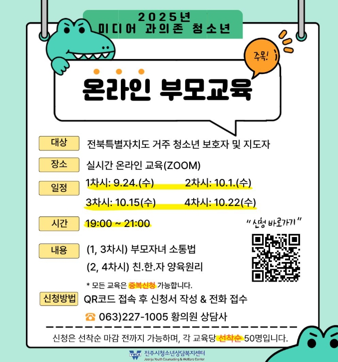 [뉴스스텝] 전주시청소년상담복지센터는 17일 ‘2025 3차 분기별 부모교육’을 시작으로 오는 10월까지 총 5회에 걸쳐 자녀의 건강한 미디어 사용조절을 주제로 한 부모 대상 교육을 온라인 실시간 교육(ZOOM)으로 운영한다.