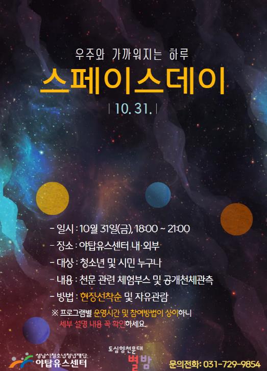 [뉴스스텝] 성남시청소년청년재단 야탑유스센터는 10월 31일 오후 6시부터 9시까지 청소년과 시민을 대상으로 우주·천문을 주제로 행사 ‘스페이스데이(SPACE DAY)’를 연다고 밝혔다.