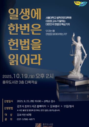 [뉴스스텝] 김포시 풍무도서관에서는 시민 교양 인문강좌의 일환으로 ‘일생에 한번은 헌법을 읽어라’를 오는 10월 19일 오후 2시부터 4시까지 운영한다.
