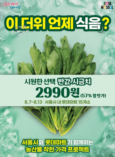 [뉴스스텝] 서울시는 기록적인 폭우에 이어 연일 계속되는 폭염으로 시민들의 장바구니 물가 부담이 커지는 가운데, 서울시농수산식품공사, 롯데마트와 손잡고 시금치 7천 단을 정상가 대비 약 57% 할인된 가격에 공급한다고 밝혔다.