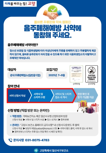 [뉴스스텝] 고양특례시 일산서구보건소는‘올바른 주류판매 약속 캠페인, 음주폐해예방 서약’에 참여할 업소를 모집한다고 밝혔다.