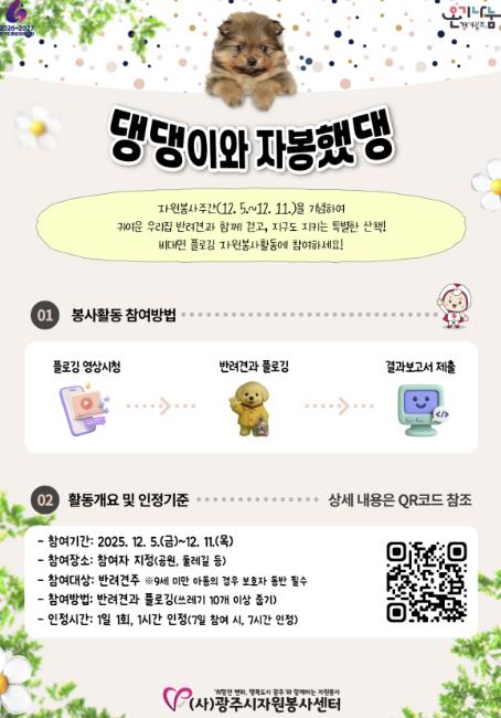 ‘댕댕이와 자봉했댕’은 12월 5일 '자원봉사자의 날'을 기점으로 일주일간 이어지는 자원봉사주간과 다가오는 ‘2026년 세계자원봉사자의 해’를 기념하여, 반려동물과 함께 걸으며, 쓰레기를 줍는 플로깅 활동으로 구성됐다. 따라서 반려견주 누구나 일상 속에서 손쉽게 참여할 수 있을 것으로 기대된다.