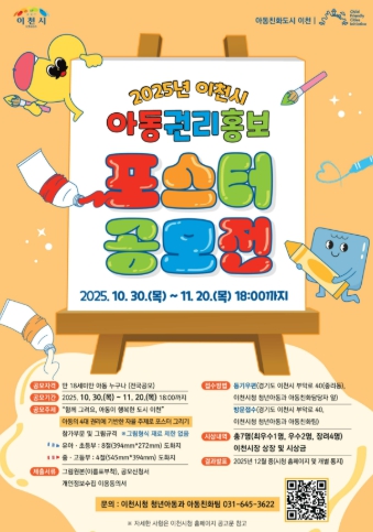 [뉴스스텝] 이천시는 10월 30일부터 11월 20일까지 아동권리에 대한 인식 확산을 위해 ‘2025년 이천시 아동권리 홍보 포스터 그리기 공모전’을 실시한다고 밝혔다.