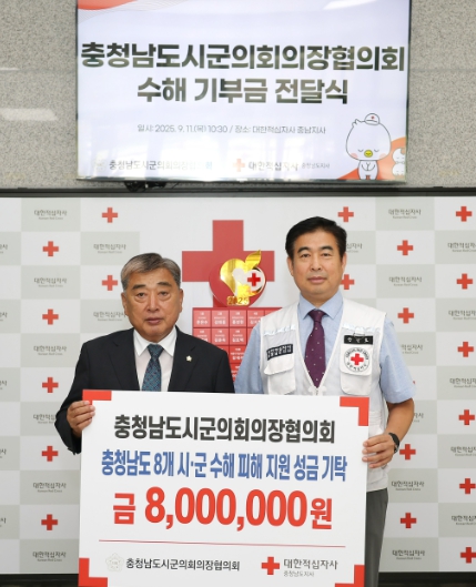 [뉴스스텝] 충남시군의회의장협의회(회장 김경제 서천군의회 의장)는 11일 대한적십자사 충남지사에 방문하여 지난 7월 집중호우로 특별재난지역에 추가 지정된 8개 시군(천안, 공주, 아산, 당진, 부여, 청양, 홍성, 서천)에 대해 총 800만 원의 성금을 기탁했다.