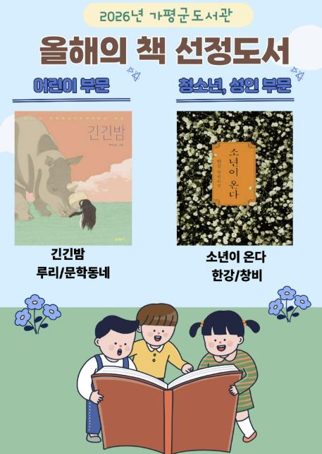 [뉴스스텝] 가평군도서관이 군민의 독서 문화 확산을 위해 ‘2026년 올해의 책’으로 루리 작가의 『긴긴밤』과 한강 작가의 『소년이 온다』를 선정했다.