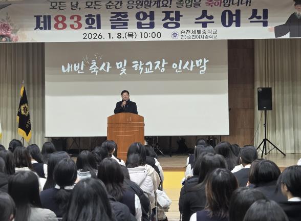 [뉴스스텝] 김정희 전남도의회 교육위원장은 1월 8일, 순천세빛중학교에서 열린 제83회 졸업식에 참석해 졸업생들의 새로운 출발을 축하하고, 전남교육의 미래를 향한 따뜻한 격려의 메시지를 전했다.