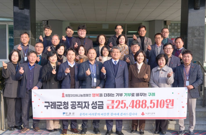 [뉴스스텝] 구례군은 군 소속 공직자들이 자발적으로 참여해 모은 성금 25,488,510원을 희망2026나눔캠페인에 기탁하며 연말연시 이웃사랑 실천에 동참했다고 밝혔다.