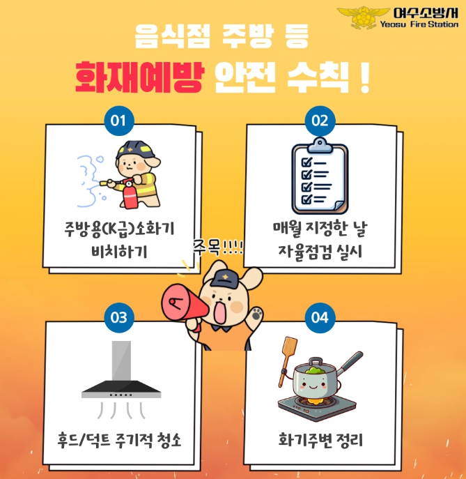 이에 여수소방서는 음식점 주방 화재 예방을 위해 다음과 같은 핵심 안전수칙을 강조했다.