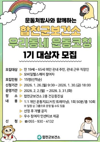 이번 1기 모집 기간은 1월 26일부터 1월 30일까지 5일간이며, 선착순 15명을 모집하고, 이후 모집 공고는 3·5·7·9월 넷째주 합천군보건소 홈페이지에서 확인할 수 있다.