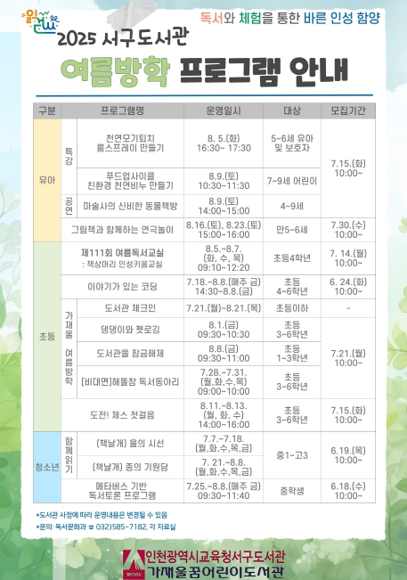 [뉴스스텝] 인천광역시교육청서구도서관은 여름방학을 맞아 7월 7일부터 8월 25일까지 청소년과 어린이를 위한 인성 함양 프로그램을 운영한다.