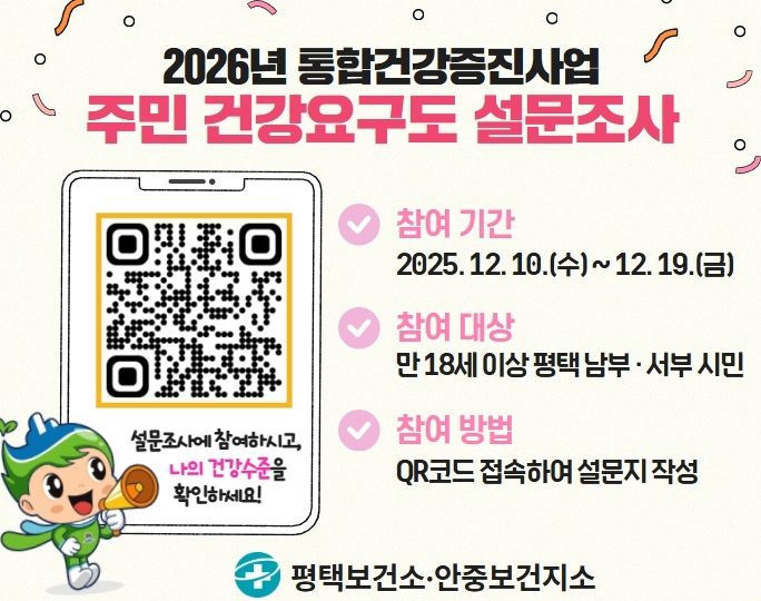 [뉴스스텝] 평택시 평택보건소는 10일부터 오는 19일까지 지역사회 주민 500명을 대상으로 2026년 통합건강증진사업 계획 수립을 위한 ‘주민 건강요구도 조사’를 시행 중이라고 밝혔다.