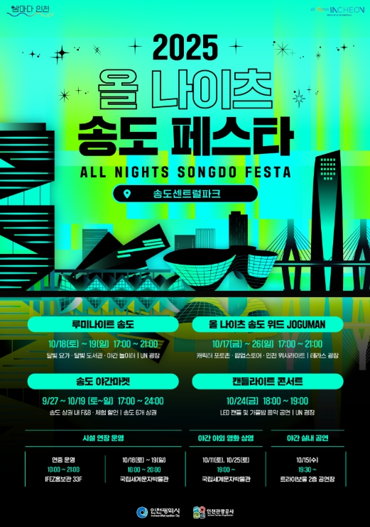 [뉴스스텝] 인천광역시와 인천관광공사는 오는 10월 17일부터 26일까지 송도센트럴파크 일대에서 '2025 올 나이츠 송도 페스타'를 개최한다고 밝혔다.