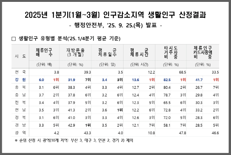 [뉴스스텝] 강원특별자치도는 행정안전부가 9월 25일 발표한 ‘2025년 1분기 인구감소지역 생활인구 산정 결과’에서 체류인구 총 2,826,012명으로 전국 최고 수준을 기록했다고 밝혔다.