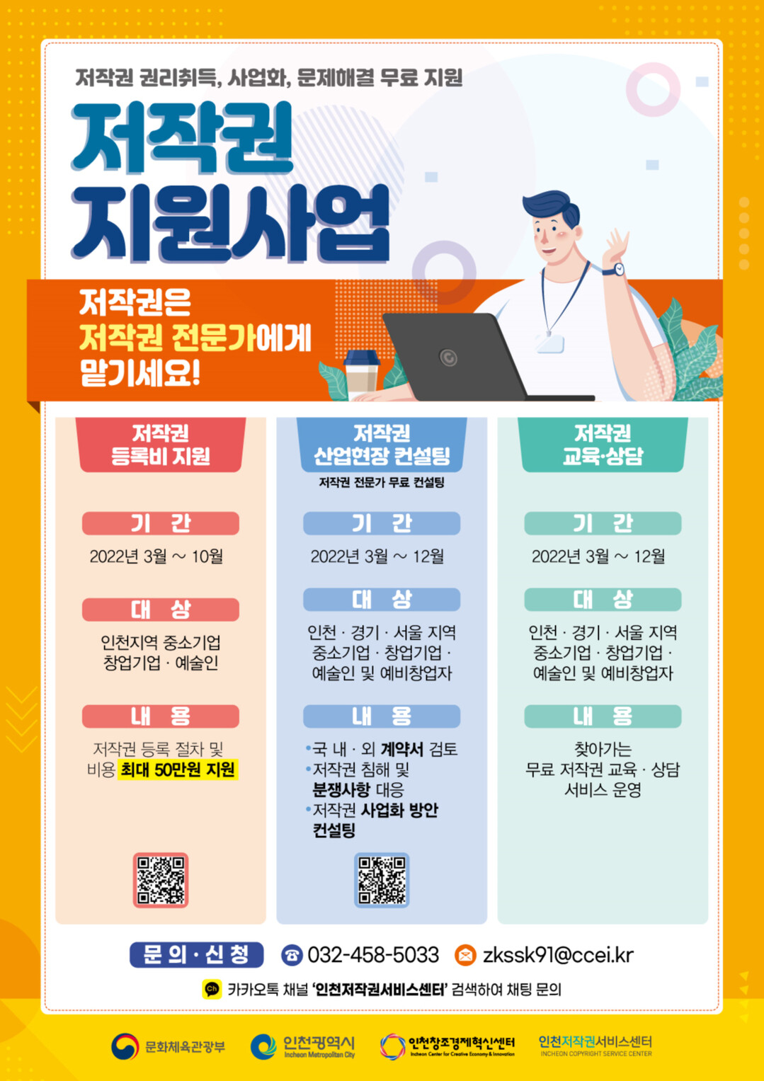 ‘저작권 등록비 지원’은 인천 지역 중소기업 및 창업 기업, 예술인에 ▲저작권 등록비 ▲저작권 등록 절차 안내를 지원한다.