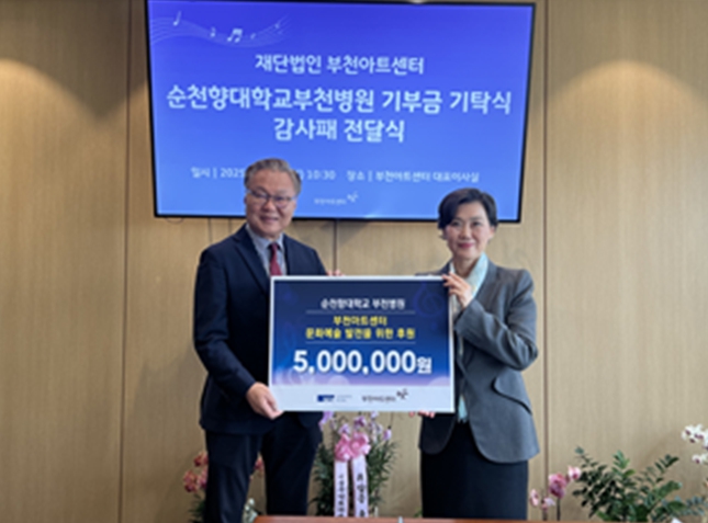 기탁식에서 박은혜 대표이사는 “부천시를 대표하는 의료기관인 순천향대학교 부천병원의 따뜻한 나눔에 진심으로 감사드린다”며, “소중한 기부금은 지역 문화예술 발전과 시민의 문화 향유 확대를 위해 의미 있게 사용하겠다”고 전했다.