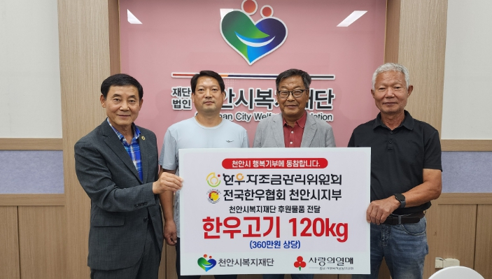 [뉴스스텝] (재)천안시복지재단은 22일 한우자조금관리위원회와 전국한우협회 천안시지부가 360만 원 상당의 한우 국거리 120kg를 기탁했다고 밝혔다.