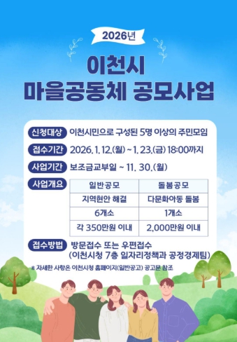 [뉴스스텝] 이천시는 주민이 직접 제안하고 실행하는 공동체 활동을 지원하기 위해 ‘2026년 이천시 마을공동체 공모사업’ 참여 공동체를 모집한다고 밝혔다.