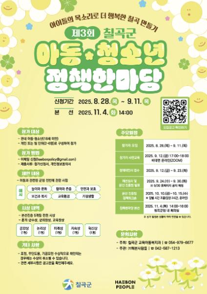 [뉴스스텝] 칠곡군은 아동과 청소년에게 군정 참여기회를 제공하고 본인의 눈높이에서 정책 참여 기회를 넓힐 수 있는‘제3회 아동·청소년 정책한마당’참가자를 오는 11일까지 모집한다.