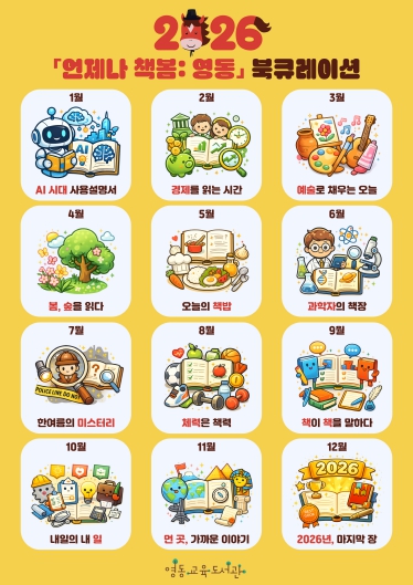 [뉴스스텝] 영동교육도서관은 2026년 1월부터 12월까지 '언제나 책봄: 영동' 북큐레이션을 운영한다. 매월 주제에 맞는 대상별 추천도서 32권을 전시하여 도서관 이용자에게 다양한 독서 경험을 제공하기 위함이다.