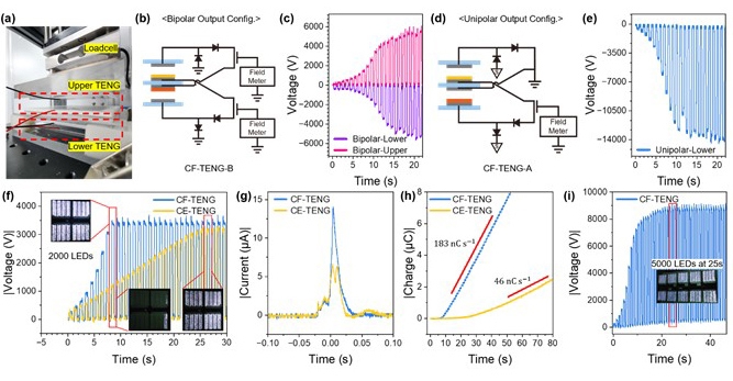 | ▲ 대면적 순환 전하 피드백 마찰전기 나노발전기(CF-TENG)의 실험 구성과 성능 시연. (왼쪽 위) 상·하부 TENG가 적층된 대면적 소자와 접촉–분리 구동 실험 장치. (가운데) 양극성·단극성 출력 모드에 따른 회로 구성과 시간에 따라 빠르게 증가하는 출력 전압 파형. (아래) 기존 구조 대비 향상된 전류·전하 축적 특성과 충전 속도 비교 결과. (오른쪽) CF-TENG를 이용해 5000개 LED 어레이를 25초 이내에 완전히 점등한 시연 모습으로, 배터리 없이도 빠르게 기동 가능한 자가구동 전원 기술의 실용 가능성을 보여준다. |