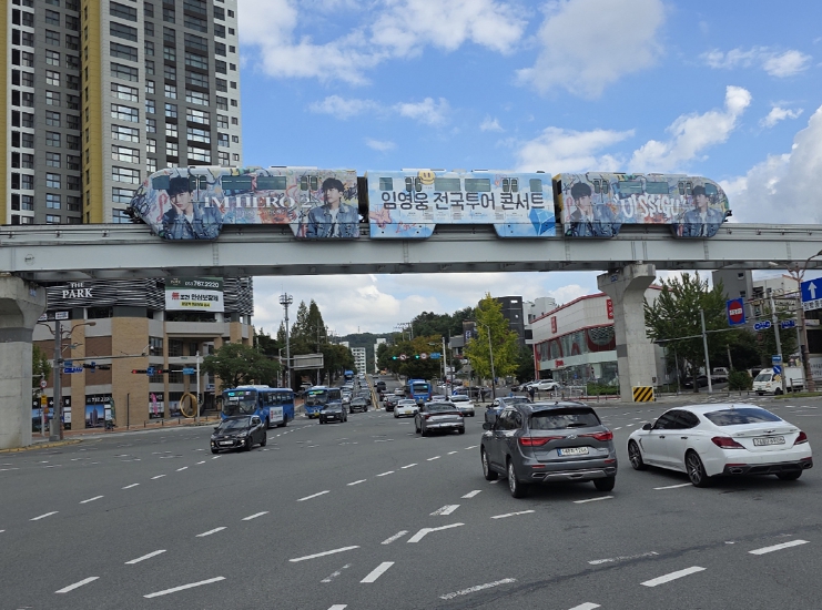 [뉴스스텝] 대구도시철도 3호선에서 운행 중인 ‘임영웅 전국투어 콘서트’ 랩핑 광고 열차가 세련된 디자인과 높은 시인성으로 시민과 팬들의 눈길을 사로잡고 있다.