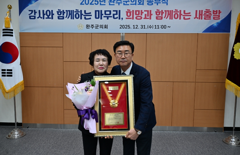 [뉴스스텝] 완주군의회 이경애 의원이 지난달 31일, 완주군의회 문화강좌실에서 열린 완주군의회 2025년도 종무식에서 전북 지방의정봉사상을 수상했다.