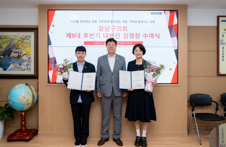[뉴스스텝] 강남구의회는 28일 제9대 후반기 대변인으로 김진경(더불어민주당, 신사·논현1동)·우종혁(국민의힘, 삼성1·2, 대치2동)을 임명했다.