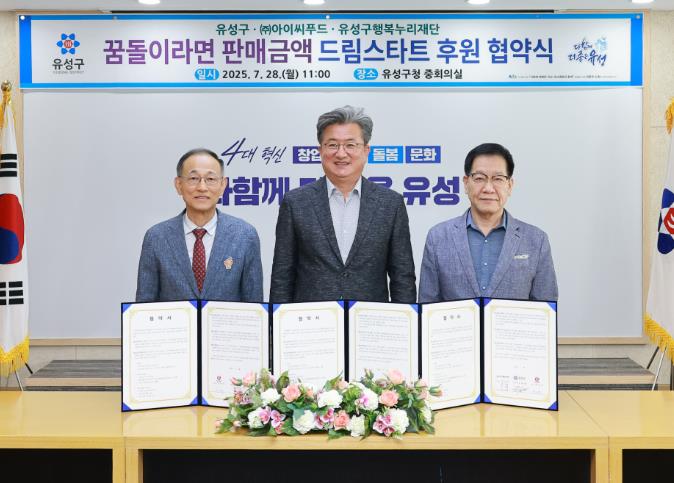 이번 협약으로 아이씨푸드는 최근 출시한 꿈돌이라면의 판매 금액 1%를 매월 유성구행복누리재단에 기부하게 된다.
