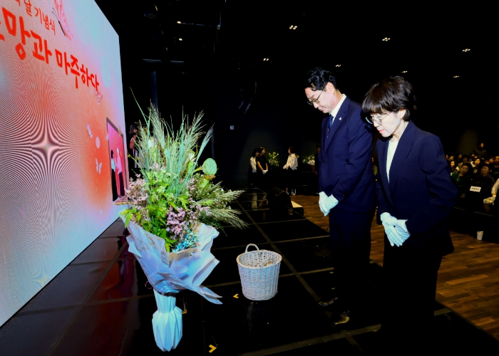 ▲ 정명근 화성특례시장과 이선희 여사 부부가 일본군 위안부 피해자 기림의 날 기념식에서 추모 헌화를 하고 있다