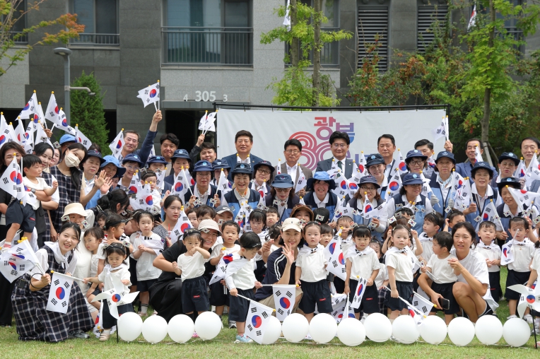 광복 80주년 광복절을 앞두고 열린 이번 행사는 손도장 찍기 등 주민참여 체험행사를 시작으로 도남숲 3단지 어린이집 원아 45명이‘태극기’동요에 맞춰 손태극기를 휘날리며 퍼포먼스를 펼치는 등 태극기로 주민들이 하나되는 시간을 가졌다.