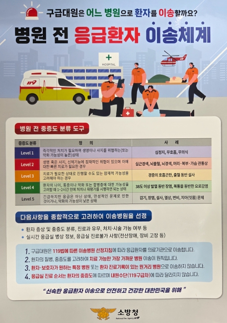 현장에서 구급대원은 환자의 증상, 의식 수준, 활력 징후 등을 종합적으로 평가해 중증도를 판단하고, 지역 의료기관의 진료 역량과 가용 정보를 함께 고려해 중증 환자는 권역·지역응급의료센터로, 경증 환자는 신속한 진료가 가능한 병원으로 이송함으로써, 의료자원의 효율적 분배와 현장 대응력 향상을 동시에 도모하고 있다.