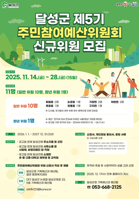 [뉴스스텝] 달성군은 11월 14일부터 28일까지 제5기 주민참여예산위원회 신규위원 11명을 모집한다.