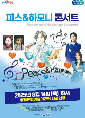 [뉴스스텝] 영광군은 오는 8월 14일 오후 7시, 영광문화예술의전당 대공연장에서 사랑과 평화, 조화의 메시지를 전하는 ‘피스&하모니 콘서트’를 개최한다고 밝혔다.