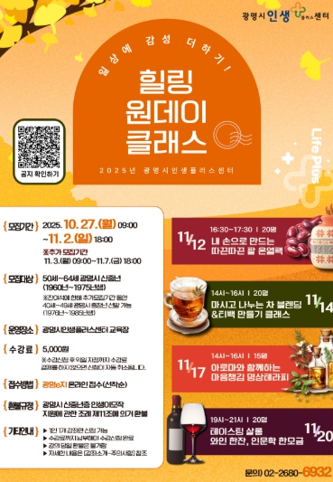 [뉴스스텝] 광명시 인생플러스센터가 오는 11월 12일부터 20일까지 신중년의 정서적 힐링과 문화 감수성 향상을 위한 ‘일상에 감성 더하기! : 힐링 원데이 클래스’를 운영한다.