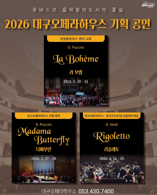 2026년 상반기에 대구오페라하우스는 푸치니 오페라 '라 보엠', '나비부인' 그리고 베르디 오페라 '리골레토'로 관객들을 만난다. 이어서 하반기에 있을 ‘제23회 대구국제오페라축제’는 야외 오페라를 시작으로, 지역 내 공연장들과 협력하여 폭 넓고, 다양한 무대에서 공연을 선보일 예정이다.